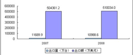 近年以來,全球DVD播放機市場呈現相對飽和、增長放緩。席卷全球的金融風暴,高額的核心技術專利費,人民幣的升值,原材料價格持續上漲和勞動力價格的上升等因素使國產DVD低成本的出口優勢逐步減弱,因此,2008年1-10月DVD播放機出口市場呈現“量降價漲”的趨勢,2008年1-10月出口為10988.59萬台,同比下降6%,出口額為510034萬美元,同比增長1.1%。出口仍以OEM加工為主。