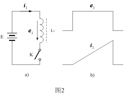 在圖1中,當輸入電壓E加於開關電源變壓器初級線圈N1的de兩liang端duan時shi,由you於yu變bian壓ya器qi次ci級ji線xian圈quan產chan生sheng的de電dian動dong勢shi與yu流liu過guo二er極ji管guan的de電dian流liu方fang向xiang正zheng好hao相xiang反fan,相xiang當dang於yu所suo有you次ci級ji線xian圈quan均jun開kai路lu,此ci時shi開kai關guan變bian壓ya器qi相xiang當dang於yu一yi個ge電dian感ganL1。其等效電路如圖2-a) 所示,圖2-b) 是開關接通時,電感兩端的電壓和流過電感L1的電流。