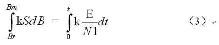 上式中,k是一個與單位製相關的係數,S為變壓器鐵心的導磁麵積,B為磁感應強度,也稱磁通密度,即:單位麵積的磁通量。把(2)式代入(1)式,並進行積分: