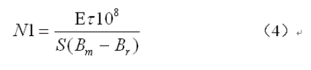 (4)式就是計算反激式開關電源變壓器初級線圈N1繞組匝數的公式。式中,N1為變壓器初級線圈N1繞組的最少匝數,S為變壓器鐵心的導磁麵積,單位:平方厘米;Bm為變壓器鐵心的最大磁感應強度,單位:高斯;Br為變壓器鐵心的剩餘磁感應強度,單位:高斯),Br一般簡稱剩磁;τ = Ton,為控製開關的接通時間,簡稱脈衝寬度,或電源開關管導通時間的寬度,單位:秒;E為工作電壓,單位為伏。式中的指數是統一單位用的,選用不同單位製,指數的值也不一樣,這裏選用CGS單位製,即:長度為厘米(cm),磁感應強度為高斯(Gs),磁通單位為麥克斯韋(Mx)。