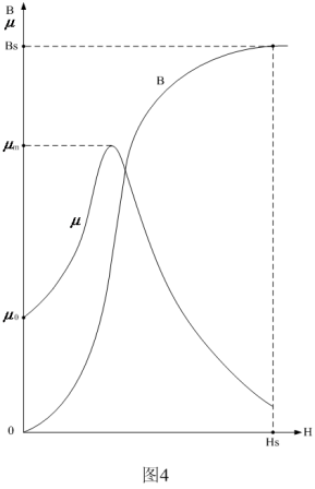 由圖3中可以看出,對應不同的磁場強度,即不同的磁化電流,磁通變化量也是不一樣的,並且磁通變化量與磁場強度不是線性關係。圖4是磁感應強度與磁場強度相互變化的函數曲線圖。圖4中,曲線B是磁感應強度與磁場強度對應變化的曲線;曲線 為導磁率與磁場強度對應變化的曲線。其中: