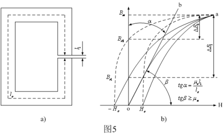 圖5-b) 中,虛線是沒留有氣隙變壓器鐵芯的磁化曲線,實線是留有氣隙變壓器鐵芯的磁化曲線;曲線b是留有氣隙變壓器鐵芯的等效磁化曲線,其等效導磁率,即曲線的斜率為