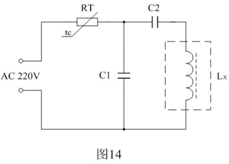 圖14中RT為熱敏電阻,Lx為行推動變壓器的初級線圈,C1為分流電容,C2為限流電容。電容C1和C2的大小,需根據行推動變壓器初級線圈勵磁電流的大小來決定。一般消磁電流需要達到極限電流Imax的3~5倍。