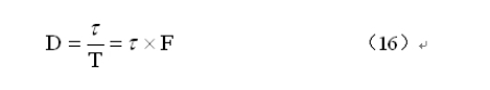 c.開關電源變壓器工作電壓的脈衝寬度 ,可由開關電源在某工作電壓狀態下(最高或最低),對應的占空比D求得。下麵(16)式和(17)式是計算脈衝寬度 和占空比D的關係式: