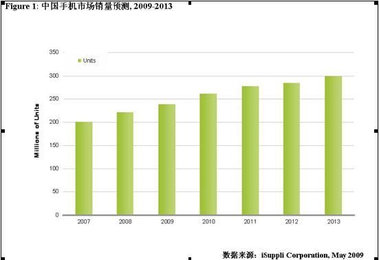 預計中國手機市場2009年的銷量為兩億三千八百萬台,較去年成長7.8%。然而受經濟危機的影響,全球手機的出貨量將呈現負增長,出貨量為11億部手機。附圖為中國手機市場銷量預測, 2009-2013