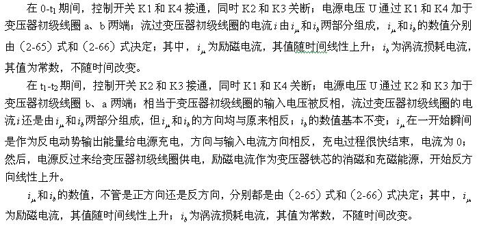 根據前麵分析,磁滯損耗主要由勵磁電流 產chan生sheng的de,但dan雙shuang激ji式shi開kai關guan變bian壓ya器qi初chu級ji線xian圈quan中zhong的de勵li磁ci電dian流liu與yu單dan激ji式shi開kai關guan變bian壓ya器qi初chu級ji線xian圈quan中zhong的de勵li磁ci電dian流liu產chan生sheng的de作zuo用yong並bing不bu完wan全quan相xiang同tong。單dan激ji式shi開kai關guan變bian壓ya器qi初chu級ji線xian圈quan中zhong的de勵li磁ci電dian流liu產chan生sheng磁ci場chang對dui變bian壓ya器qi貼tie芯xin進jin行xing充chong磁ci和he退tui磁ci外wai,其qi存cun儲chu的de能neng量liang隻zhi能neng用yong來lai作zuo為wei反fan激ji式shi輸shu出chu給gei負fu載zai,因yin為wei變bian壓ya器qi初chu級ji線xian圈quan輸shu入ru的de電dian壓ya是shi單dan極ji性xing脈mai衝chong,變bian壓ya器qi初chu級ji線xian圈quan無wu法fa換huan相xiang。