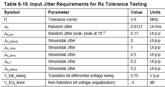 在接收機測試中,碼型發生器和待測試芯片的擴頻時鍾功能(SSC)都打開,輸出信號的特征需滿足下圖3所示:信號的峰峰值大於750毫伏,-3dB的去加重,隨機抖動的RMS值為0.0121UI(Unit Interval的簡稱,即1個比特的時間),即0.0121*200ps = 2.42ps,添加的正弦抖動的頻率為500kHz、1MHz、2MHz、4.9MHz、50MHz,其對應的抖動峰峰值為2UI、1UI、0.5UI、0.2UI、0.2UI。要求在添加了上述數量的隨機抖動和正弦抖動後誤碼率小於 。其中,頻率低於500KHz的抖動大於2個比特,說明USB3.0芯片的接收端需具備較強的抖動過濾能力,因為多數開關電源工作在這個頻段。