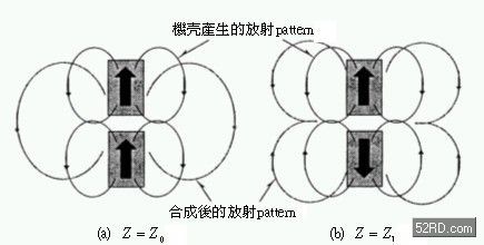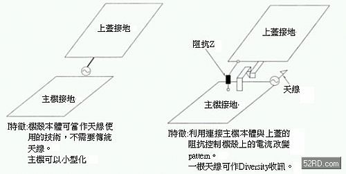 此處采取在連接移動通訊係統折疊機殼上增設阻抗(Impedance)Z,如此就能夠利用一種天線獲得多樣的放射pattern,這種設計最大優點是可以大幅縮小天線的設置場所與天線結構物的尺寸。