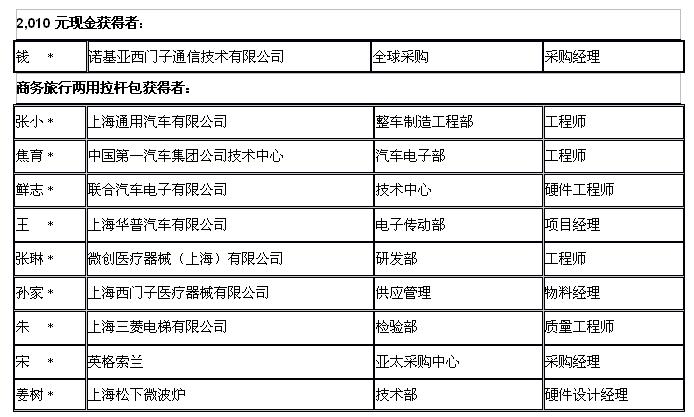 慕尼黑電子展以自己的獨特魅力吸引和凝聚著中國電子社群,與會觀眾包括工業控製、通信、消費電子、汽車電子、醫療,而且以大中企業居多。為了答謝中國電子社群對慕尼黑上海電子展9年以來的關注,主辦方推出了“萬元現金,回饋產業!”的抽獎活動。一等獎3名,可獲得2010元現金,二等獎從原先的15名增至30名,獎金金額對應展會當天日期,分別是316元、317元和318元,三等獎是商務旅遊兩用拉杆包,共有30名。同時預登記觀眾還有機會獲得精美晴雨傘。具體獎金抽取及領取辦法,可登陸e-p-china查詢。