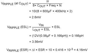 選擇輸出電容的關鍵參數是實際電容值、ESR、ESL和額定電壓。這些參數會影響係統的整體穩定性、輸出電壓紋波以及瞬態響應,輸出紋波電壓包含三部分,即輸出電容儲存電荷的變化,電流流入、流出電容時在ESR和ESL上產生的壓降。下麵給出了選擇電容使用的公式。