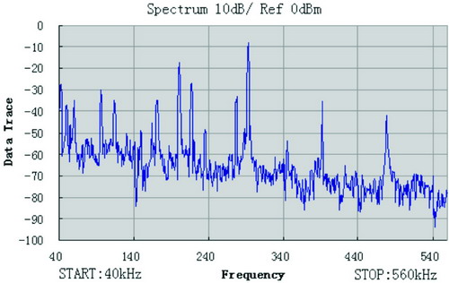 中壓電力線平均噪聲功率在-60~-70dBm/Hz左右。其中,由多種低功率噪聲的疊加而成的有色背景噪聲功率一般在-60~-70dBm/Hz之間,在一些頻段可低於-80dBm/Hz,其整體隨頻率增高而減弱,且功率譜變化較慢,一般為分鍾甚至小時量級;主要由通信帶寬內的廣播電台等其它無線通信信號造成的窄帶噪聲,平均占用2k~4kHz的帶寬,功率較高,較背景噪聲高出約30~50dBm/Hz,該類幹擾一般長時穩定存在;對通信效果影響最大的是衝激噪聲,該類噪聲隨機產生,持續時間很短,一般為幾十或者幾百毫秒,絕大部分功率高於背景噪聲10~30dBm/Hz,當衝激噪聲發生時,噪聲頻段內的數據傳輸將可能出現嚴重的突發性誤碼。圖3為我國農村中壓電力線在40k~560kHz頻段內的典型噪聲頻譜。