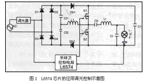 通過采樣燈電流以及調光器後麵的輸入電壓的平均值,經過一定的比例調整後利用L6574內的誤差放大器對開關S1/S2的頻率進行調整,從而使諧振電路的阻抗變化對燈進行調光。