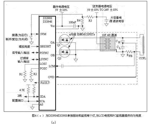 圖6(c)為用DS3984(4通道)和DS3988(8通道)CCFLkongzhiqijijiejuelebenwensuotidaodesuoyouzhexieshejitiaozhan。kejiangzhexieqijianpeizhiweimeigetongdaoqudongyigedeng,huozhemeitongdaoduogedeng,yonghukelinghuocaijiansheji,yimanzuzijidexingjiabimubiao。duogeDS3984/DS3988可輕鬆級聯,以支持任意數量的燈,來為LCD電視屏提供背光照明。