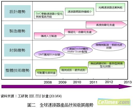 金融風暴過後,連接器產品技術革新仍持續推進,以下將由設計、製造、封裝/組裝三大構麵探討連接器技術層麵的發展趨勢(見圖二):
