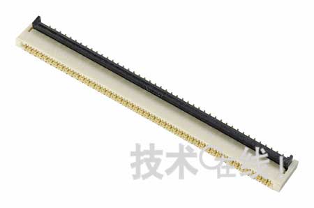 此製品以間距0.3mm、高1.1mm、進深4.3mm(滑片鎖上時)尺寸,製成了90引腳的多極連接器。合適的FPC厚度為0.2mm。因采用上下配備接點的構造,設計時可無需考慮插入的FPC接點方向。