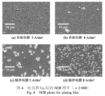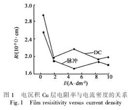 圖1是電沉積Cu層電阻率與電流密度之間的關係。可見,脈衝電鍍得到的Cu鍍層電阻率小於相同電流密度下的直流鍍層。在小電流密度時(<2A/dm2),直流鍍層和脈衝鍍層的電阻率都較大。