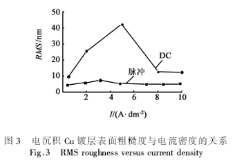 圖3為脈衝電鍍與直流電鍍電沉積Cu鍍層表麵粗糙度RMS(rootmeansquare)與電流密度的關係。可見脈衝所得鍍層表麵粗糙度僅為幾個納米,而直流所得鍍層表麵粗糙度在10nm以上,最大時甚至達到了40nm,這樣大的粗糙度將為後續CMP工藝造成極大的困難。而平整的表麵可以為CMP工藝提供一個易於進行處理的基底表麵,采用脈衝電鍍Cu鍍層的表麵粗糙度RMS比直流電鍍的低。