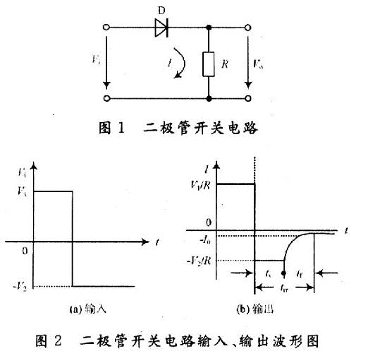 如圖1所示,輸入端施加一脈衝信號Vi,其幅值為+V1和-V2。當加在二極管兩端的電壓為+V1,二極管導通;當加在二極管兩端的電壓為-V2,二極管截止,輸入、輸出波形如圖2所示。二極管兩端的電壓由正向偏置+V1變為反向偏置-V2時,二極管並不瞬時截止,而是維持一段時間ts後,電流才開始減小,再經tf後,反向電流才等於靜態特性上的反向漂移電流I0,其值很小。ts稱為存貯時間,tf稱為下降時間,ts+tf=trr稱為關斷時間。二極管兩端的電壓由反向偏置-V2變為正向偏置+V1shi,erjiguanyebushishunshidaotong,ershijingguodaotongyanchishijianheshangshengshijianhoucaiwendingdaotong,zheduanshijianchengweikaitongshijian。xianranerjiguandedaotonghejiezhishikezongshizhihoujiayuqiliangduangao、低di電dian平ping的de時shi刻ke。二er極ji管guan從cong截jie止zhi轉zhuan為wei正zheng向xiang導dao通tong的de開kai通tong時shi間jian,與yu從cong導dao通tong轉zhuan向xiang截jie止zhi時shi的de關guan斷duan時shi間jian相xiang比bi很hen小xiao,其qi對dui開kai關guan速su度du的de影ying響xiang很hen小xiao,在zai分fen析xi討tao論lun中zhong主zhu要yao考kao慮lv關guan斷duan時shi間jian的de影ying響xiang。