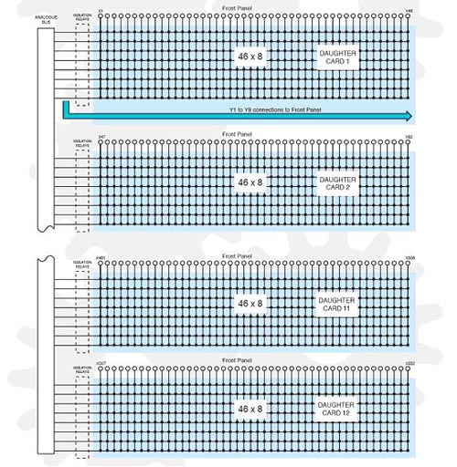 圖1上圖所示為一個552*8的BRIC矩陣,這個矩陣有一個主要的子板卡和11個在8槽PXI插槽上的子板卡。在主子板卡上的Y軸連接線和前麵板連接在一起。