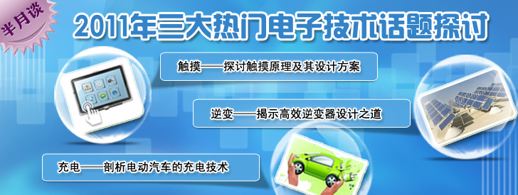 在“蘋果”和“環保”概念下,觸摸技術、逆變器技術以及新型充電技術討論將在延2011年nian繼ji續xu延yan伸shen。本ben期qi半ban月yue談tan將jiang與yu大da家jia一yi起qi探tan討tao觸chu摸mo屏ping在zai設she計ji的de時shi候hou需xu要yao注zhu意yi哪na些xie要yao點dian,如ru何he提ti高gao光guang伏fu逆ni變bian器qi效xiao率lv以yi及ji新xin型xing充chong電dian技ji術shu的de技ji巧qiao。