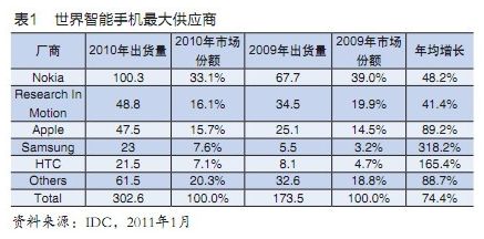 2010年智能手機獲寵熱銷,世界頂級手機廠商經營冷熱互見,手機業老大諾基亞,以及名列三、四的LG和Sony-Ericsson都因未及時趕上智能手機浪潮而致市占率滑落,RIM、蘋果與宏達(HTC)等公司看準苗頭,強勢出擊,傾力經營智能手機而擴大了市占率,名列前八的Motorola則又因傳統手機跌幅太大而致市占率萎縮(見表1)。