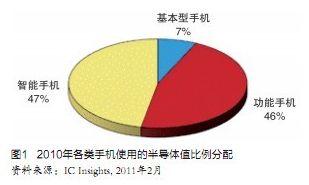 平均算來,現今一部手機使用的半導體價值約30美元,世界全部手機使用的半導體總值約占半導體市場近20%,是僅次於PC和消費電子的第三大應用產品,足見其影響力。智能手機的半導體含量更大,它裝備更加優良的處理器,更多的DRAM和NAND。據稱,它與基本手機半導體含量之比約為9:1,其對半導體業的重要性更可見一斑。市場調研公司IC Isights報告指出,2010年世界手機使用半導體產品共425億美元,其中智能手機(Smartphone)200億美元,占47%,首次超過增強型手機(Enhanced),基本型手機(Basic)用半導體僅30億美元,占7%(見圖1)。預計2014年手機使用半導體將增至555億美元,年均增長率7.5%,智能手機使用半導體則將以每年20%的速度迅猛成長,屆時將達416億美元,獨占手機用半導體的75%,相反基本型手機屆時將進一步縮減至僅為16億美元,隻及2010年的一半。