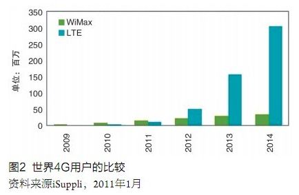 TD-LTE的主要競爭技術標準是WiMAX,它的應用早於前者。據iSuppli公司調查,2009年TD-LTE尚未投入應用,而WiMAX已擁有680萬用戶,預期近兩年內還將居於主導地位。不過,TD-LTE在世界頂級運營公司如美國的AT&T和Verizon、歐洲的Vodafone和TeliaSonera、日本的DoCoMo等的積極努力推動下將加速發展,今年用戶即可超70萬,明年用戶數將超越WiMAX,2014年可望突破3億大關,而屆時WiMAX僅能維持2003年3300萬左右的水平,兩者相差10倍(見圖2),由此可見TD-LTE的發展潛力。
