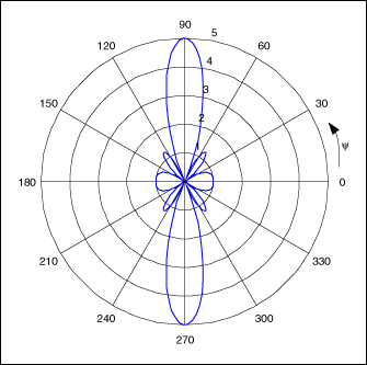 圖2.五單元天線矩陣(單元間相差為零)產生的輻射圖,天線位於原點,沿x軸以半波長為間距。[page]