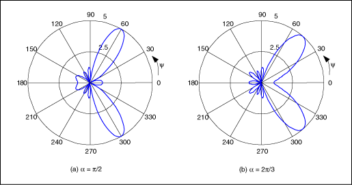 除了改變波瓣的寬度,通過對連續單個天線的信號設定固定的相位延遲α(圖3),還可以實現主波瓣在x–y平麵內的旋轉。天線陣列的輻射圖正比於天線陣列係數F(u):