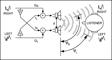 當聆聽兩個揚聲器發出的聲音時,左聲道的聲音先到達左耳,後到達右耳;右聲道的聲音先到達右耳,後到達左耳。右耳聽到較低音量的左聲道信號,左耳聽到較低音量的右聲道信號。這種效應稱為音頻串擾(圖1)。