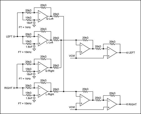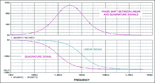 無源方案可以實現該電路,但是更通用的方法是有源電路(圖7)。對於線性信號(相應的輸入通道),電路呈現為一個ft=10kHz的相移濾波器,對於積分信號(另一路輸入),電路呈現為一個ft=1kHz的相移濾波器。目的是使線性輸入信號和積分信號之間在音頻帶寬1kHz至10kHz範圍內呈現90°相移。