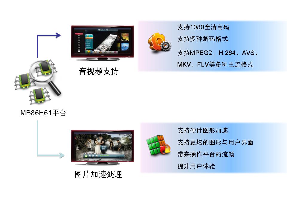 MB86H61係列芯片基於多核CPU架構,內部集成了富士通獨有專利技術的硬件視頻處理器視頻解碼單元解碼全高清/標清MPEG-2、H.264、VC-1、AVS、FLV、MKV等多種視頻格式,而音頻解碼單元則采用高性能的ARC725TM(594DMIPS)支持DD、DD+、AAC、DRA等多種先進音頻格式。因此,該芯片的ARM11內核主CPU將全部用於處理應用程序,其性能將有足夠的裕量,能充分保證係統運行的平穩流暢。“獨立的硬件圖形加速功能還使其能更輕鬆地支持豐富的圖形用戶界麵、高清圖片顯示,從而大大提升用戶體驗。”富士通半導體業務發展總監黃自力表示,“該芯片對於全高清AVS視頻解碼的支持尤其值得一提,目前市場上大部分的高清芯片所能支持的AVS解碼還停留在標清階段。”