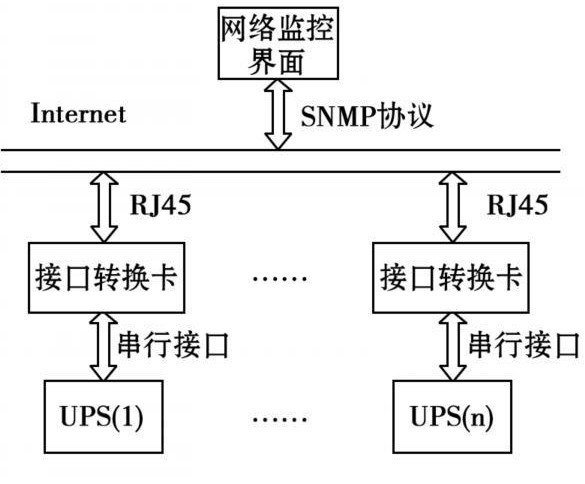 整個係統的核心為基於SNMP網(wang)絡(luo)管(guan)理(li)協(xie)議(yi)的(de)接(jie)口(kou)轉(zhuan)換(huan)卡(ka)。接(jie)口(kou)轉(zhuan)換(huan)卡(ka)一(yi)端(duan)通(tong)過(guo)網(wang)線(xian)與(yu)監(jian)控(kong)計(ji)算(suan)機(ji)相(xiang)連(lian),管(guan)理(li)人(ren)員(yuan)通(tong)過(guo)計(ji)算(suan)機(ji)可(ke)方(fang)便(bian)地(di)對(dui)其(qi)進(jin)行(xing)操(cao)作(zuo)。接(jie)口(kou)轉(zhuan)換(huan)卡(ka)另(ling)一(yi)端(duan)通(tong)過(guo)與(yu)UPS上的串行接口連接,來獲取UPS工作的各種信息及參數,然後再利用SNMP協議將接收到的數據轉換為管理信息庫(MIB)節點的變量值。管理員通過網絡管理軟件對MIB節點變量進行操作,從而獲得各UPS的監控信息,實現了安全可靠的遠程分散式管理。