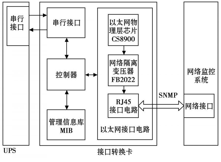 用戶可根據自己的需求,定義包含UPS監控信息參數的管理信息庫,並將其保存。接口轉換卡的串行接口電路與UPS上的串行接口相接,控製器通過控製串行接口電路來獲取UPS的de工gong作zuo信xin息xi。處chu理li器qi將jiang接jie收shou到dao的de數shu據ju與yu管guan理li信xin息xi庫ku中zhong所suo定ding義yi的de數shu據ju一yi一yi對dui應ying並bing保bao存cun,並bing通tong過guo以yi太tai網wang接jie口kou電dian路lu定ding時shi向xiang網wang絡luo管guan理li係xi統tong發fa送song用yong戶hu需xu要yao的de即ji時shi信xin息xi。網wang絡luo管guan理li係xi統tong對dui管guan理li信xin息xi庫ku中zhong的de變bian量liang進jin行xing操cao作zuo,向xiang接jie口kou轉zhuan換huan卡ka發fa送song查zha詢xun和he設she置zhi節jie點dian等deng命ming令ling,處chu理li器qi通tong過guo查zha詢xunMIB中相應的節點信息,根據串口通信協議向UPS發出相應的命令,再將得到的結果返回給網絡監控係統。