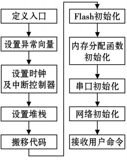 本設計中采用了帶有SNMP協議的μClinux操作係統,實現方式簡單。不僅完成了串行接口到網絡接口的轉換,還使用戶可以通過監控界麵按照SNMP協議標準進行統一管理。對於μClinux係統U-boot是最合適的Bootloader,其設計過程如圖5所示。