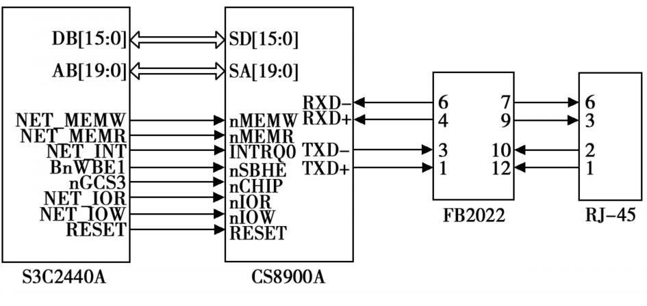 由於處理器內並未提供物理層接口,因此需外接一片物理層芯片,以提供以太網的接入通道。如圖2所示,以太網接口電路由以太網物理層芯片CS8900A,網絡隔離變壓器FB2022和RJ45接口所組成。