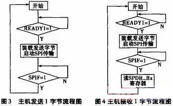 (2)軟件部分:單片機為主控製器,首先查詢從機狀態標誌位READY是否為1,判斷是否可以與從機通信。從機準備就緒時,單片機可裝載1字節發送數據,啟動CPLD內部SPI接口電路,查詢並等待SPI傳輸結束標誌位SPIF為1,完成一字節數據傳輸,如此重複。圖3、圖4為主機發送與接收1字節流程圖。
