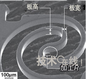采用電鑄可以形成如圖2的微細形狀。除了可以將部件的板寬降至板厚的1/3以外,還可以將加工R減至0.04mm。同時,每個表麵都很光滑。
