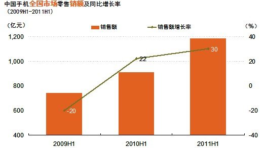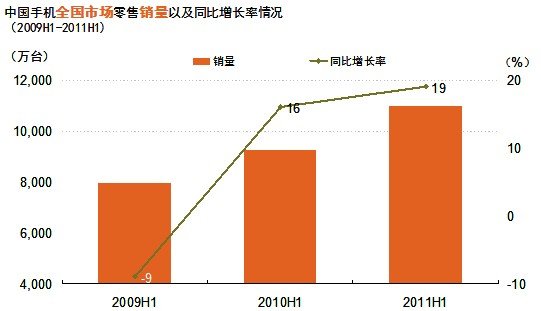 2011年上半年手機市場繼續保持較快增長。據GfK(捷孚凱中國)全國零售監測數據顯示,2011年上半年銷售量已達到1.1億台,同比增長19%,銷售額達到1186億元,銷售額同比增長30%。
