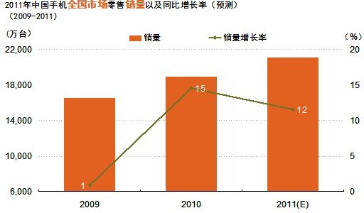 2011年上半年中國的手機市場在3G加速發展,智能手機大力推廣以及運營商的推動共同作用下延續了2010年的增長勢頭,但是2011年下半年的手機市場規模與上半年相比將略有下降,銷量將達到1.02億台,銷售額將達到1166億元。據GfK預測,2011年全年手機銷售額將達到2352億元,手機銷量將達到2.1億台,同比上升12%。