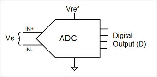 用於將傳感器信號數字化的ADC也是比例器件。無論其內部架構如何,所有ADC都是通過對未知輸入電壓與已知參考電壓相比較來工作的。轉換器的數字化輸出是輸入電壓與參考電壓的比值乘以ADC的滿量程讀數。考慮到內部放大和設計的多樣性,還需要一個比例因子K。無論K值大小,隻要ADC的配置未改變,K值都保持固定不變。公式4描述了一個普遍意義上的ADC (圖2)的數字讀數(D)和輸入信號(Vs),參考電壓(Vref),滿量程讀數(FS)以及比例因子(K)間的關係。