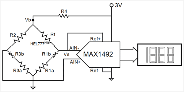 根據公式19,R4的值不會影響讀數。電路中增加R4可以降低RTD的自身熱量。同時也減弱了來自電橋的信號,並且降低了參考電壓。雖然MAX1492無內部PGA,但是它允許使用較小的參考電壓。使用較小的參考電壓可以省去額外的放大電路。