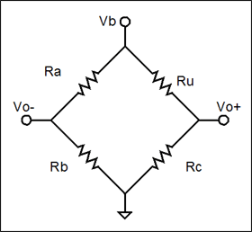 圖9是(shi)一(yi)個(ge)由(you)同(tong)一(yi)電(dian)壓(ya)源(yuan)供(gong)電(dian)的(de)兩(liang)個(ge)分(fen)壓(ya)器(qi)組(zu)成(cheng)的(de)惠(hui)斯(si)通(tong)電(dian)橋(qiao)。習(xi)慣(guan)將(jiang)電(dian)橋(qiao)畫(hua)成(cheng)菱(ling)形(xing),因(yin)為(wei)這(zhe)種(zhong)形(xing)狀(zhuang)強(qiang)調(tiao)了(le)同(tong)一(yi)電(dian)壓(ya)源(yuan)為(wei)每(mei)個(ge)分(fen)壓(ya)器(qi)供(gong)電(dian)的(de)重(zhong)要(yao)性(xing)。電(dian)橋(qiao)的(de)輸(shu)出(chu)(Vo)是兩個分壓器輸出電壓之差(公式15)。當Vo為零時,稱電橋達到平衡。在這種條件下,因為Ve與一個為零項相乘,所以激勵電壓(Ve)的精確值並不重要。公式16可計算出平衡電橋中未知電阻(Ru)的阻值。在實際應用中,通常使Ra = Rb,這樣公式16可簡化為Ru = Rc。