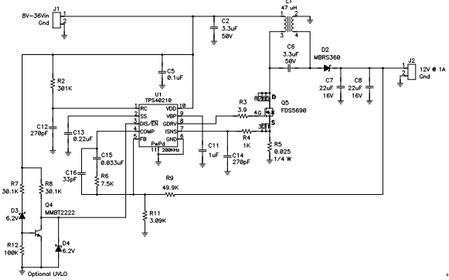 構建起如圖3 所示電路,並對其進行描述。該電路可在汽車市場獲得應用。這裏,其擁有一個8V 到36V 的寬範圍輸入,可以為穩定12-V 輸出以上或者以下。汽車市場更喜歡使用陶瓷電容器,原因是其寬溫度範圍、長壽命、高紋波電流額定值和高可靠性。結果,耦合電容器(C6) 便為陶瓷的。這就意味著,相比電解電容器,它擁有較高的AC 電壓,同時這種電路會對低漏電感值更加敏感。