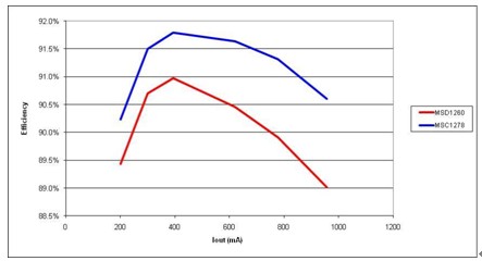 圖5 由於更少的電流,高漏電感(MSC1278) 產生更高的效率