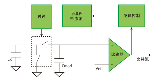 為了能夠使用微控製器來分析傳感器電容,傳感器電容(Cf)需要轉換成數字值。圖3顯示了其中一種電容式感應預處理電路框圖。(注:有多種測量傳感器電容的方法。)