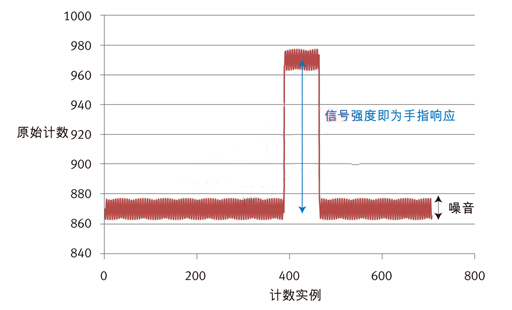 圖5:原(yuan)始(shi)傳(chuan)感(gan)器(qi)數(shu)據(ju)由(you)手(shou)指(zhi)響(xiang)應(ying)和(he)噪(zao)音(yin)構(gou)成(cheng)。手(shou)指(zhi)響(xiang)應(ying),也(ye)稱(cheng)為(wei)信(xin)號(hao)強(qiang)度(du),是(shi)當(dang)手(shou)指(zhi)放(fang)在(zai)傳(chuan)感(gan)器(qi)上(shang)時(shi)通(tong)過(guo)感(gan)應(ying)係(xi)統(tong)可(ke)以(yi)看(kan)到(dao)的(de)原(yuan)始(shi)計(ji)數(shu)的(de)差(cha)別(bie)