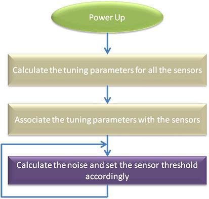 噪zao聲sheng是shi一yi個ge隨sui機ji時shi間jian函han數shu,由you其qi自zi身shen性xing質zhi決jue定ding。工gong作zuo一yi個ge小xiao時shi後hou和he剛gang開kai機ji時shi是shi不bu一yi樣yang的de,下xia一yi個ge時shi刻ke又you不bu相xiang同tong。因yin此ci,手shou指zhi檢jian測ce的de閾yu值zhi應ying基ji於yu傳chuan感gan器qi原yuan始shi計ji數shu檢jian測ce到dao的de噪zao聲sheng來lai調tiao整zheng。圖tu8顯示了自調試係統如何基於係統噪聲調整手指閾值。