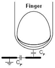 要感應到手指的存在,電容式感應係統首先要知道沒有手指時的傳感器電容(見圖2a),也稱為寄生電容(Cp)。當手指接近或接觸傳感器時(見圖2b),傳感器電容值將會變化,這就產生了和Cp並聯的另一個電容,稱為手指電容(Cf)。有手指存在時,總傳感器電容(Cx)如方程1所示: