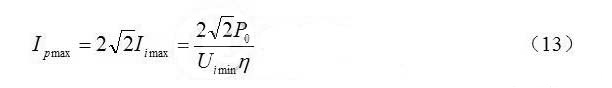 為避免音頻噪聲,在輸入電壓範圍內,開關頻率應在20kHz以上。從以上分析可知,在最高輸入電壓峰值時,開關頻率最低。故假定在最高輸入電壓峰值的開關周期為50μs.由式(11)求得